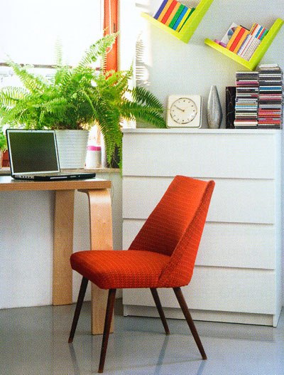 Зробити приміщення динамічним допоможуть яскраві акценти. В даному прикладі це полиці, крісло з яскравою оббивкою і зелень кімнатної рослини.