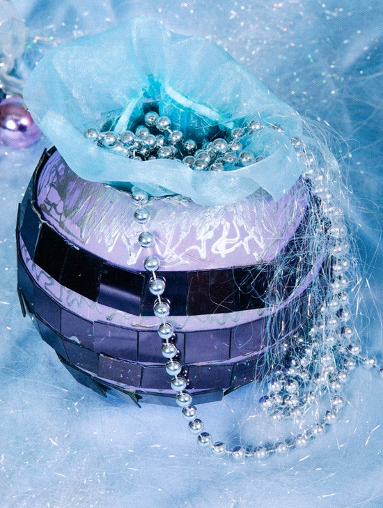 4. Перед Новим роком завжди продається безліч солодощів в дуже оригінальній прозорій упаковці - наприклад, у вигляді дзвіночка. Її можна декорувати і використовувати в якості упаковки для подарунка. Для цього вам будуть потрібні упаковка від цукерок, різнокольорові контури для скла, вітражні фарби для скла та великі паєтки. Спочатку за допомогою контуру нанесіть узор на поверхню коробочки. Потім розфарбуйте вітражними фарбами і приклейте паєтки. Верх коробочки оформіть великою кількістю паєток.