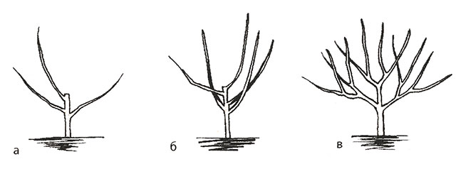 Рис. 1. Формування вазообразной крони яблуні: а - з 3 основними скелетними гілками; б - з 5 основними скелетними гілками; в - після третьої підрізування