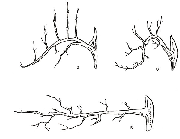 Рис. 3. Формування веретеновидного куща з допомогою отгибания гілок: а - правильний вигляд; б, в - неправильний