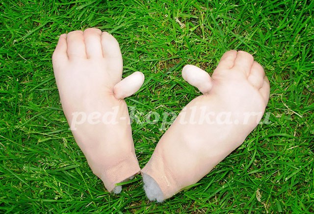 Руки можна виготовити з капронових шкарпеток або нижній частині цих колготок. Набиваємо їх синтепоном, прошиваємо пальчики швом «назад голочка», стягаємо кінчики пальців і одягаємо кисті рук на каркас.