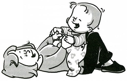 «Пиріжки». Ляжте на підлогу на спину, попередньо підклавши під голову валик, зігніть ноги в колінах. Посадіть малюка зверху так, щоб його ноги були розведені, а стопи упиралися в підлогу. Візьміть руки дитини в свої і рухайте їх вперед-назад, до себе і від себе, в одну і в іншу сторону, читаючи потешку: