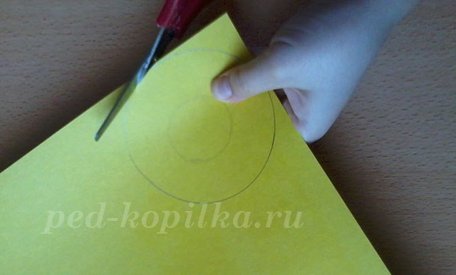 1) На жовтому картоні обводимо за шаблоном коло, всередині нього малюємо маленький коло. Вирізаємо велике коло.