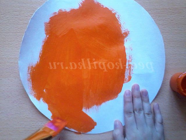 5) З білого картону вирізаємо велике коло, розфарбовуємо його жовтим або оранжевим кольором.