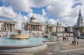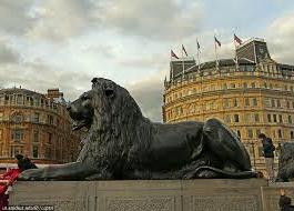 3. The center of London is Trafalgar Square. Some people say it is the most beautiful place in London. In the middle of the square stands a tall column. It is a monument to Admiral Nelson. Four bronze lions looks at the square from the monument. There are two beautiful fountains in the square. They are in front of the National Gallery which is one of the best picture galleries of the world.