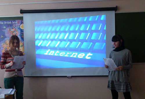 Після презентації теми уроку, повторення слів по темі, я перейшла до постановки цілей і задач уроку: «Today Technology is everywhere and it's in constant progress. That's what we going to experience in the nearest future. With the introduction of Microsoft Windows, and 3G 4G technologies, with the appearance of iPods, smartphones, addictive social networking websites, blogs, forums, Internet shopping; technological developments have impacted our lives in a way that we can't imagine this world without their presence. While technological developments have made life amazingly easier, simpler and anything is just a mouse's click away, it has brought several negative health impacts, psychological problems and stress in daily life. The theme of our lesson is Technology in its broad sense. The aim of our lesson is to present your points of view on this problem topics connected with technology, to share your results of the small scientific survey which was hold at our lyceum. So today our work will be organized in the following way:
