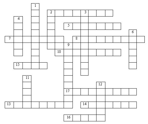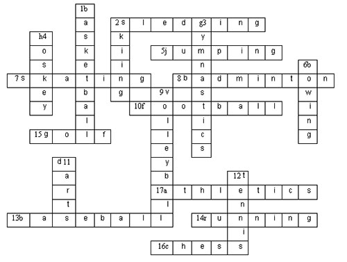 Horizontal: 2. Катання на санках. 5. Стрибки. 7. Буває фігурне. 8. Гра з ракетками і воланчиком. 10. Спортивна гра з м'ячем. 13. Бейсбол. 14. Біг. 15. Гольф. 16. Шахи. 17. Легка атлетика.
