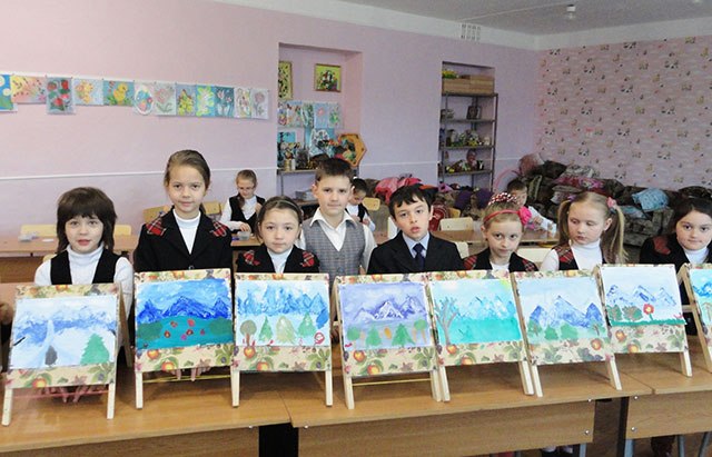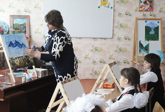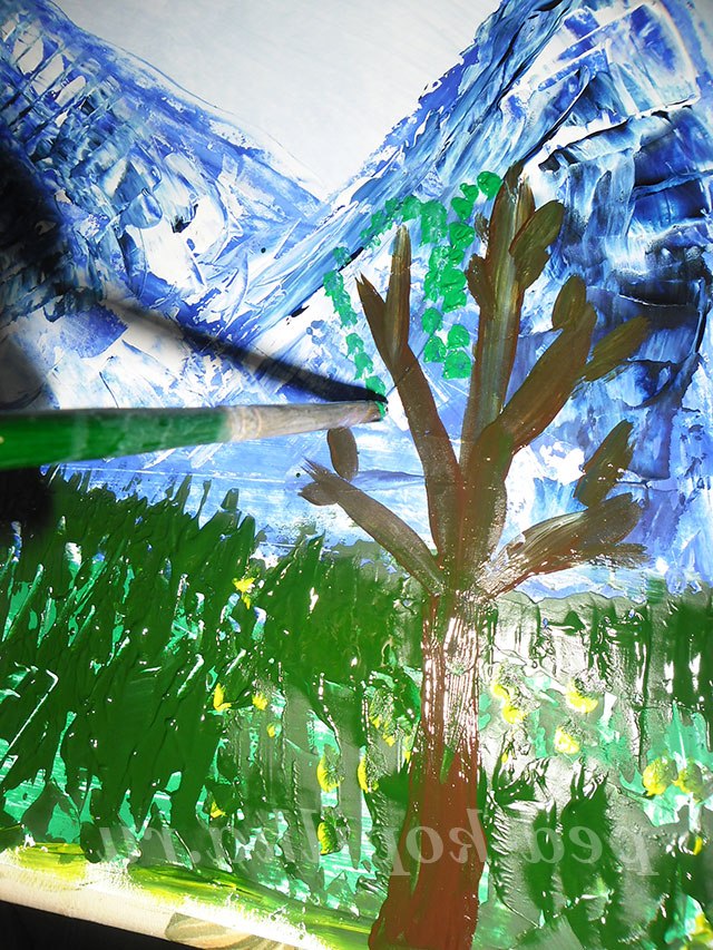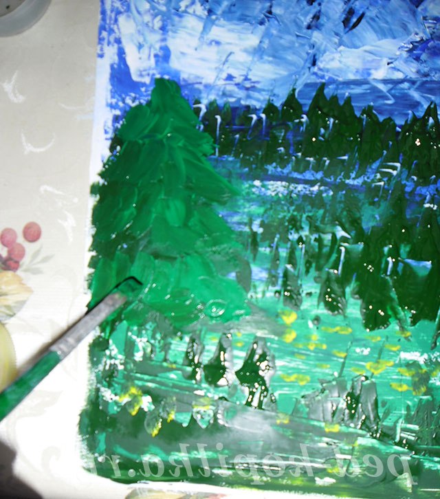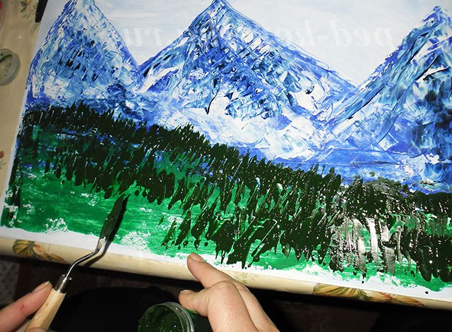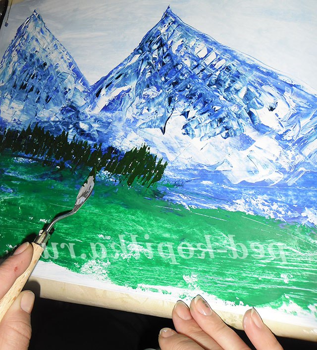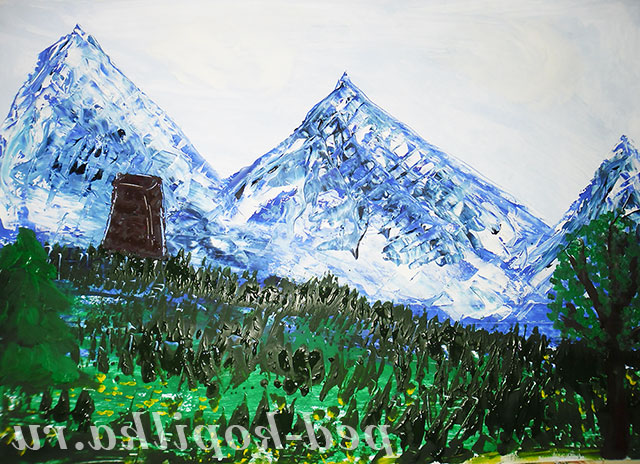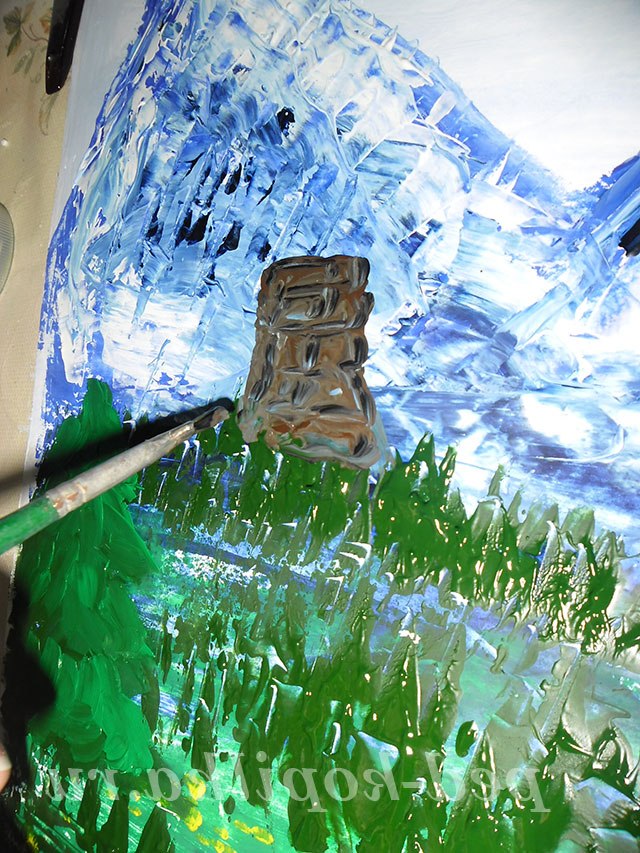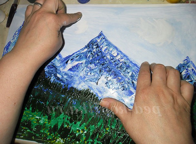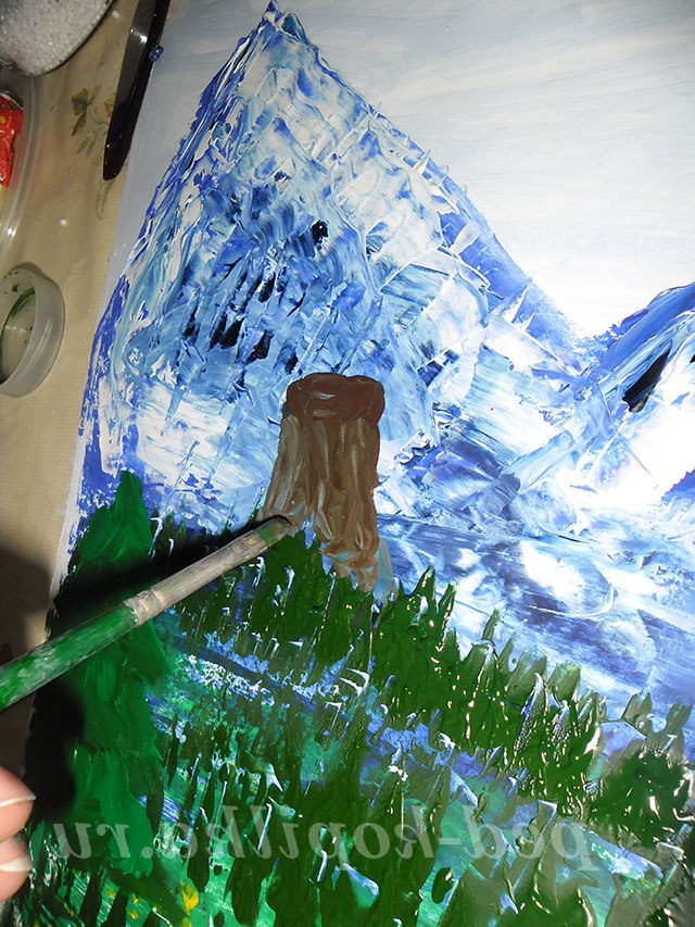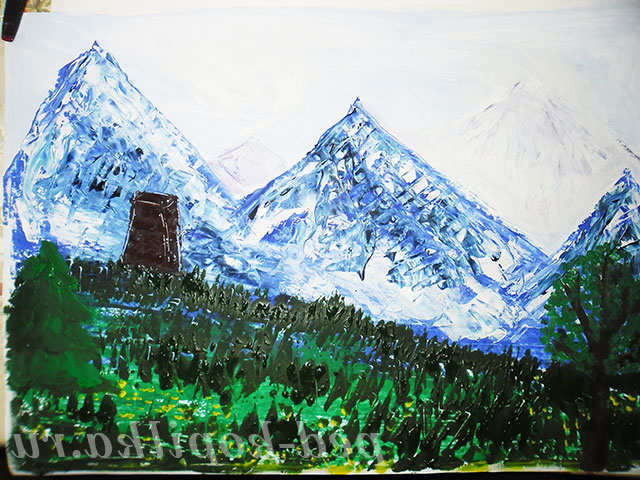 15. Задній план трохи мізерний - потрібно додати більше снігові вершини гір. З допомогою мастихіни і білої гуаші оформляємо ще дві гірські вершини.