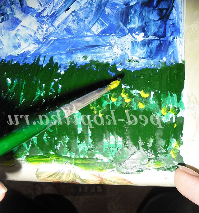 9. Тонким пензлем жовтим кольором наносимо фрагменти квіткових галявин.