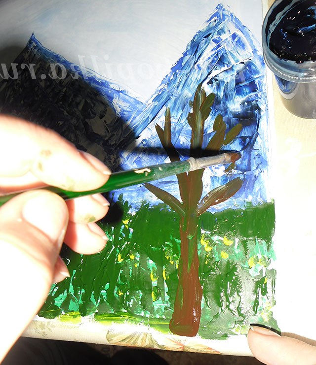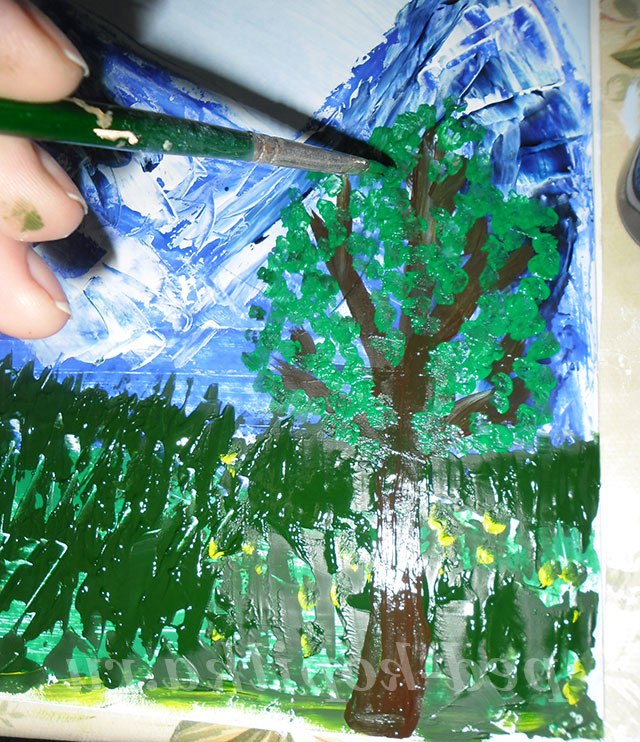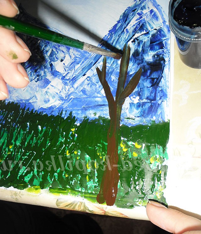 10. Переходимо до переднього плану нашого малюнка. Нагадую, що предмети на передньому плані більш великі. У нижньому лівому куті малюємо коричневим кольором стовбур дерева і зеленим кольором оформляємо йому крону.