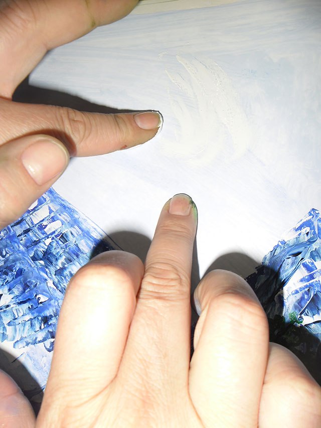 13. На небі можна додати легкі повітряні хмари - це зручно зробити, вмочивши палець у білу гуаш і розтушувавши її на малюнку.