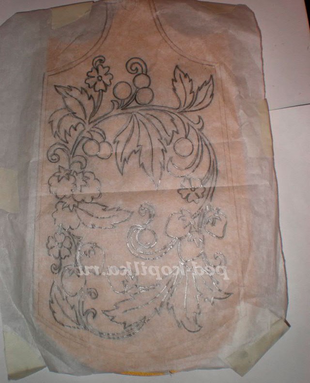 4. Переводимо малюнок на поверхню дошки. Із зворотного боку кальки обводимо контур м'яким олівцем. Кладемо цією стороною на поверхню дошки і обводимо з лицьової сторони кальки контур малюнка. Таким чином, графіт від м'якого олівця віддрукується на поверхні дошки.
