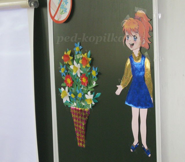 Вчитель. Великий букет, маленький букетик, всього один квітка - завжди радість. Але живі квіти швидко в'януть, навіть якщо міняти воду у вазі кожен день. Спробуйте створити букет (або об'ємну аплікацію) з кольорового паперу.