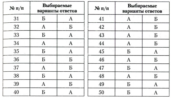 Кожен член команди отримує бланк з питаннями тесту. Для прискорення обробки анкет можна роздати хлопцям таблицю з незаповненими даними у графах «обрані варіанти відповідей», а при перевірці результатів використовувати наведену нижче таблицю-ключ у вигляді перфокарти.