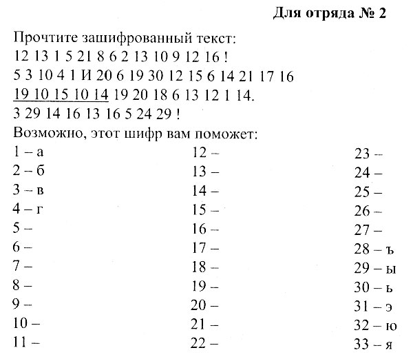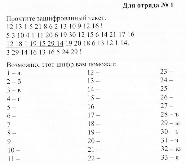 На ранковій лінійці в останній день табірної зміни на адресу кожного загону по табірної пошті приходять конверти. У конвертах зашифроване завдання: