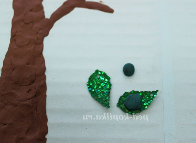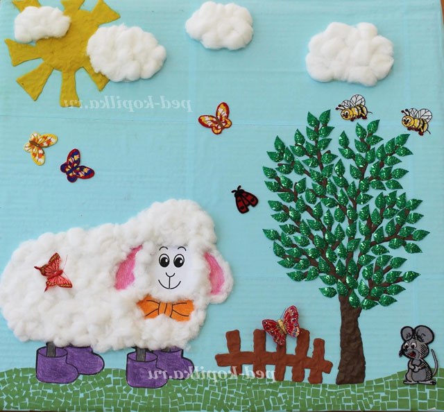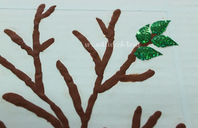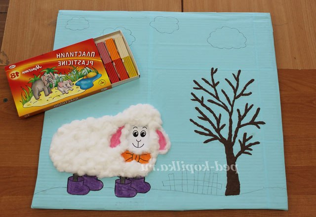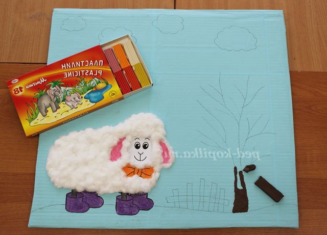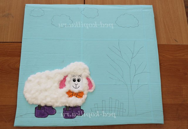 4. Далі простим олівцем можна намітити малюнок, що б ви хотіли побачити на своїй картині. Ми захотіли «відправити свою овечку» в літо, на природу. Всі елементи картини можна виконувати в різній техніці і використовуючи (знову повторюю) будь-який матеріал. На цій картині для зображення дерева ми використовували пластилін і, використовуючи прийом пластилинографии, « розфарбували» наше дерево. Листочки на дереві - це паєтки у вигляді листочків. Тримаються вони на пластиліні. Це деревце можна було «розфарбувати» як березу. Теж дуже красиво виглядає.