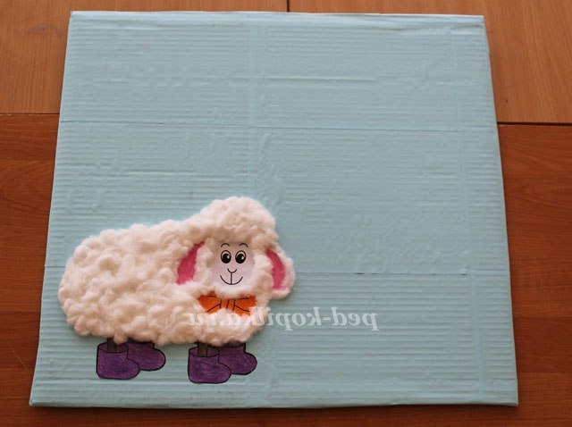 3. На цьому етапі нам знадобиться: клей ПВА і звичайна кольорова вата. Щоб овечка виглядала пухнастою і об'ємної - обклеюємо її ватою.