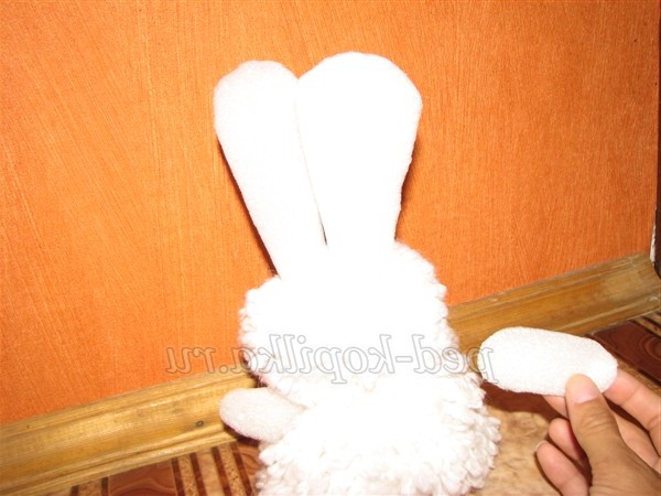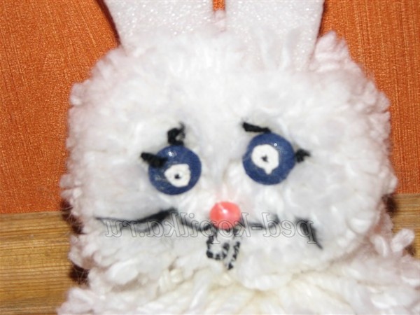 11. Пришиваємо кролику очки і носик з відповідних гудзиків, ниток можна зробити вуса і вії, передніх зуба можна вирізати з пінопласту і обшити навколо чорними нитками, щоб вони виділялися. Все це за вашим бажанням.