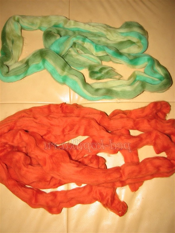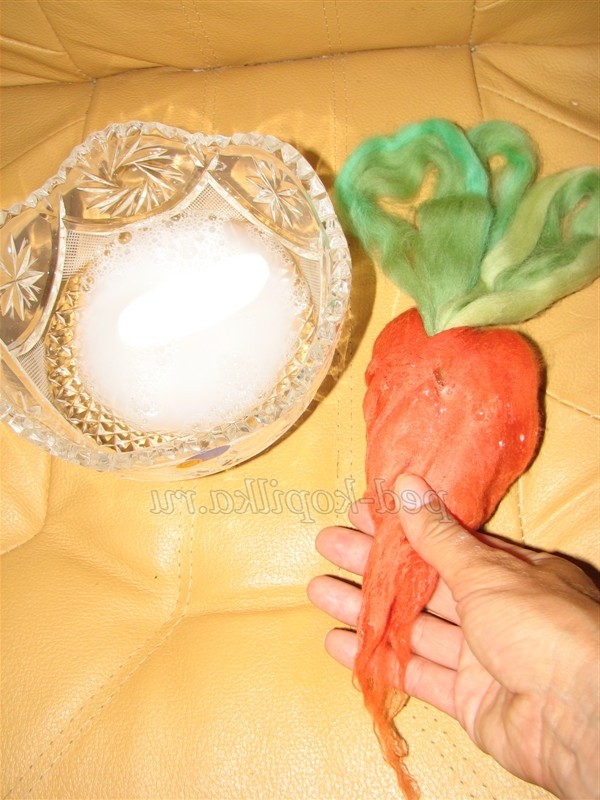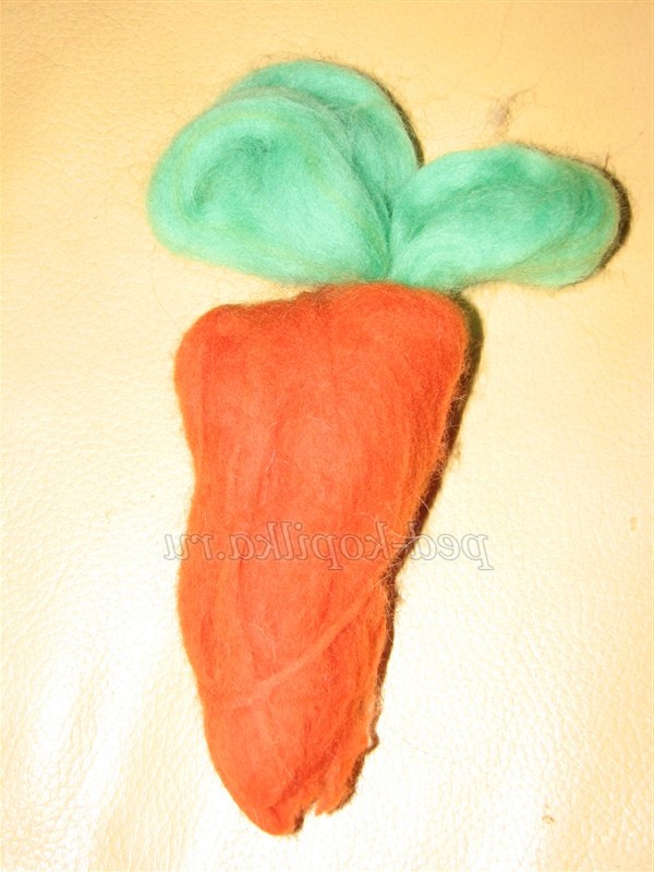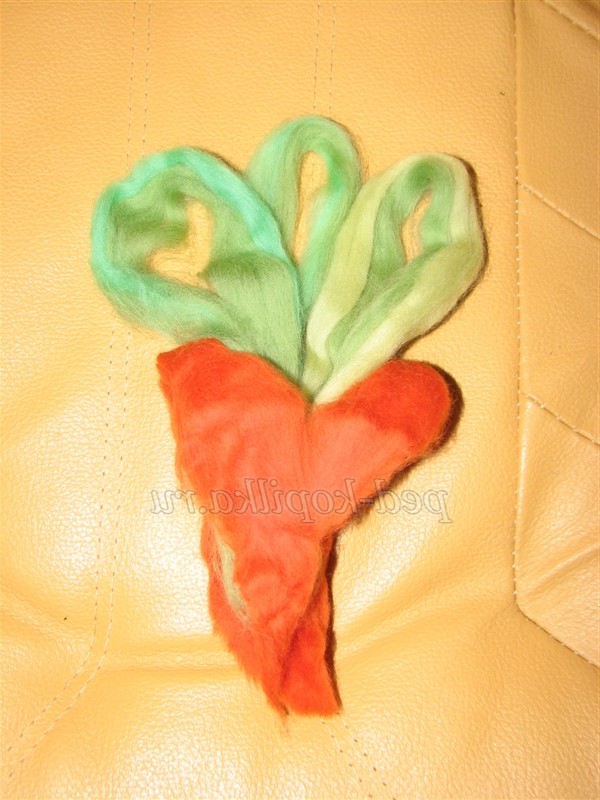 12. Морквину робимо з вовни для валяння. Для цього беремо трохи вовни морквяного й зеленого кольору. Одночасно створюючи конусну форму морквини, всередину пропускаємо шерсть зеленого кольору. Після того як конусна форма моркви створена, акуратно пропрасовуємо її теплим мильним розчином поки поверхня не буде зваляне. Морквина виходить з твердою скоринкою, більш пластичною, ніж при мокрому валянні і не таким твердим як при сухому.