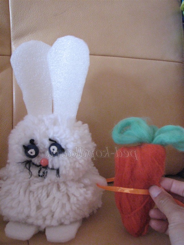 13. Морквину прив'язуємо до лапці кролика за допомогою стрічки морквяного кольору через дірочку, яка зроблена в лапці кролика.