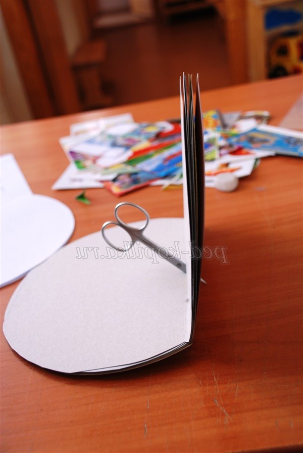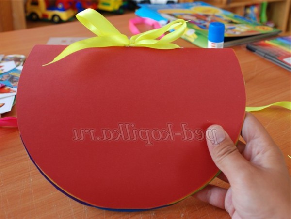 - беремо кольоровий картон, складаємо його навпіл: кольором всередину, обводимо півколо і вирізаємо
