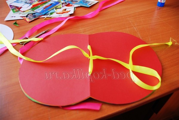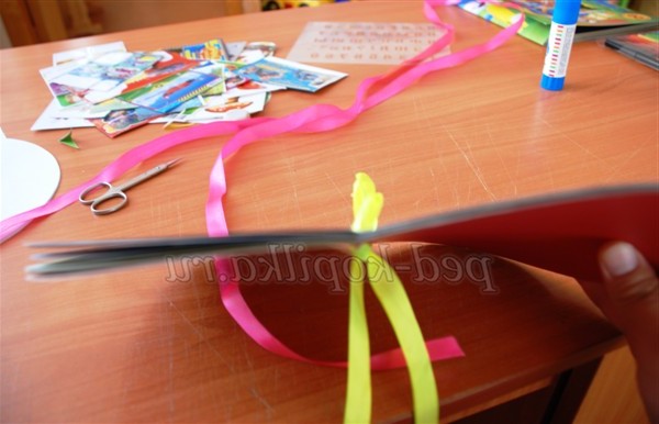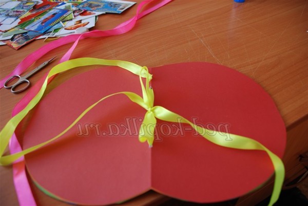 - обидва кінці стрічки повинні виявитися зовні по середині, зав'язуємо бантики, зайві кінці обрізаємо ножицями