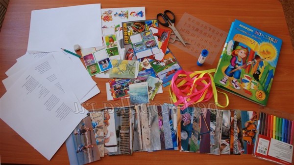 Обладнання: кольоровий картон, фломастери, клей-олівець, трафарет, простий олівець, гумка, атласна стрічка, ножиці гострі (або шило), звичайні ножиці, аркуш паперу А4, вірші (згідно теми, а у нас подорож і літо), тематичні наклейки, вирізні картинки, фотографії.