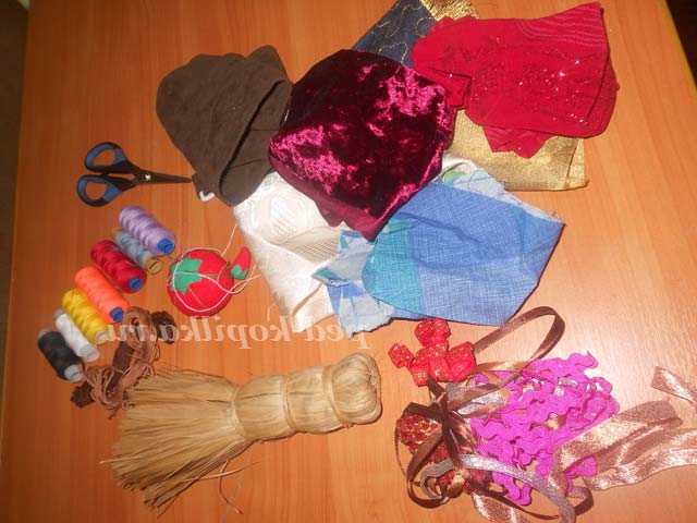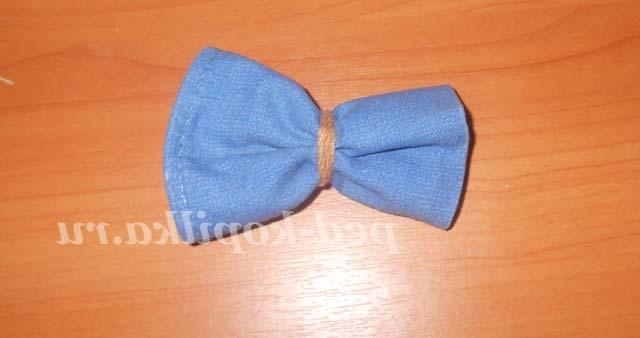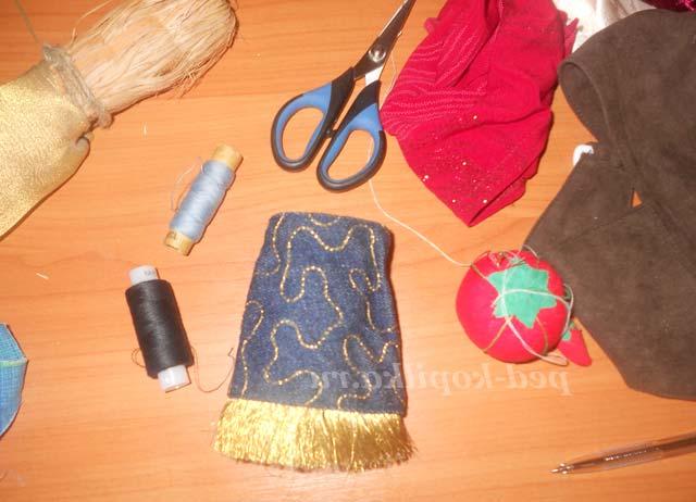 7. Приділимо увагу головного убору. Вирізаємо прямокутний шматок тканини і прошиваємо його, а потім нитками муліне зав'язуємо по середині. Виходить своєрідна метелик. Одягаємо її на голову нашої Боярині.