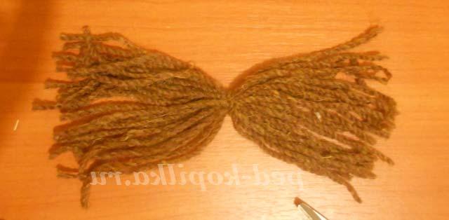 5. Займемося зачіскою. Для цього використовуємо пряжу (або нитки муліне). Колір і довжину вибираємо за бажанням. Взявши пряжу, вирізаємо кілька пасом однакової довжини і перев'язуємо їх по середині.