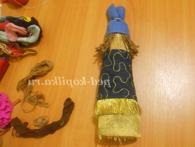 8. Виготовляємо руки : скористаємося паличками, гілочками, а так ж тканиною, з якої виготовили під'юбник. Обмотуємо гілочки тканиною і зав'язуємо нитками муліне з кожного краю по черзі, прикріплюємо до нашої ляльці.