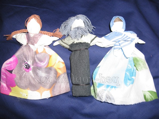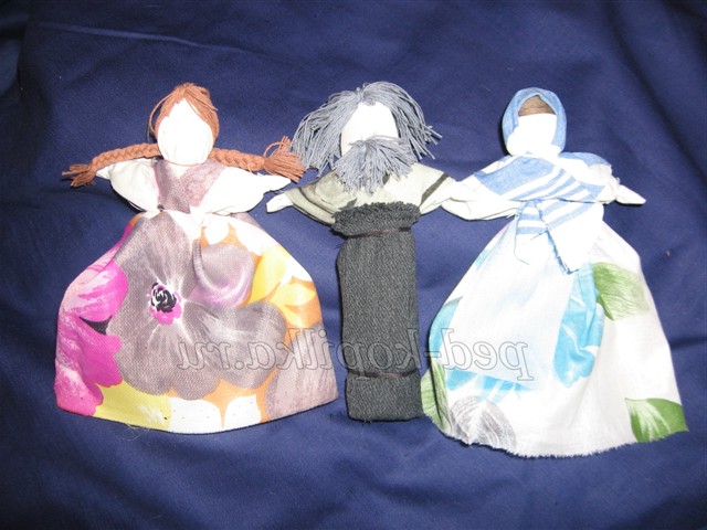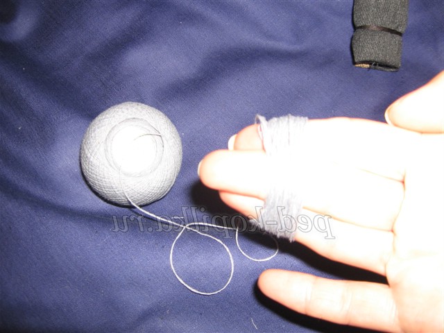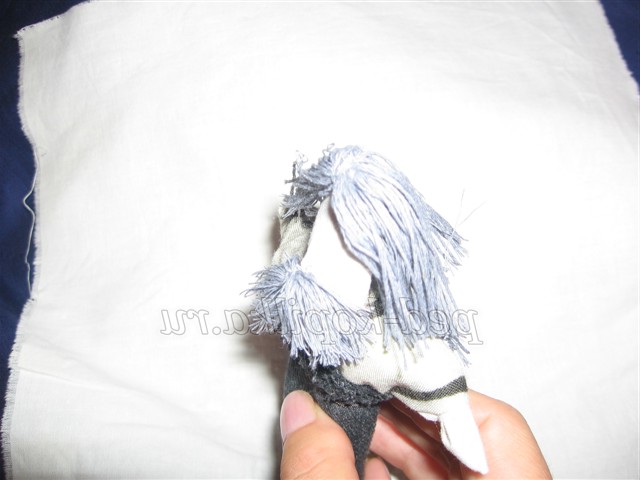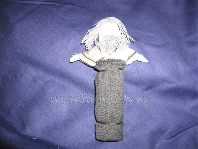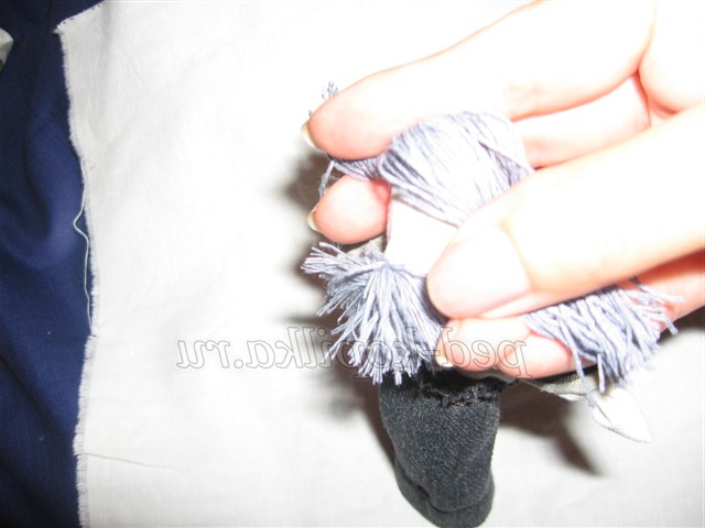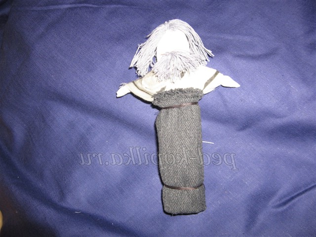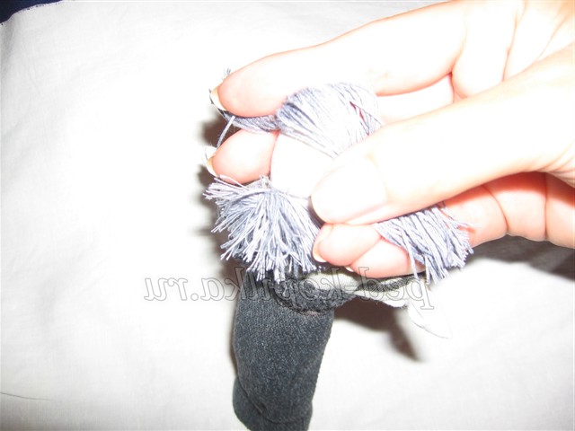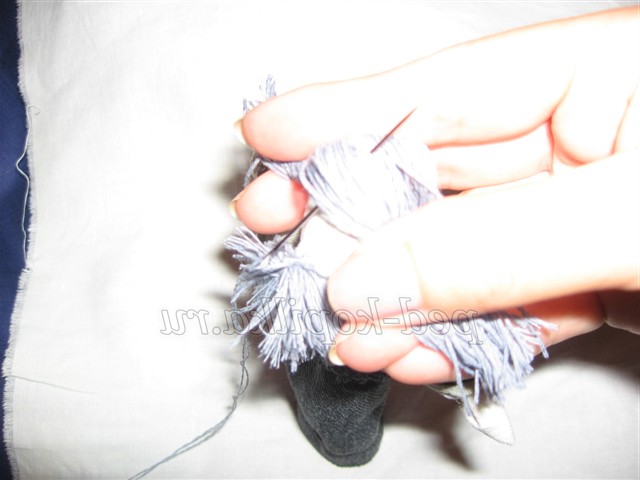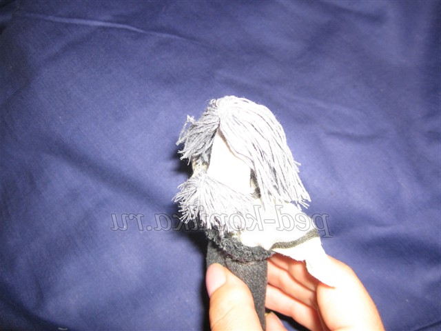 12. Для волосся намотати сірі нитки на три пальці, розрізати з двох сторін, прикласти до голови ляльки, пришити назад голкою.
