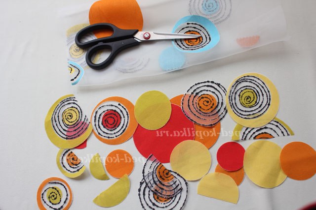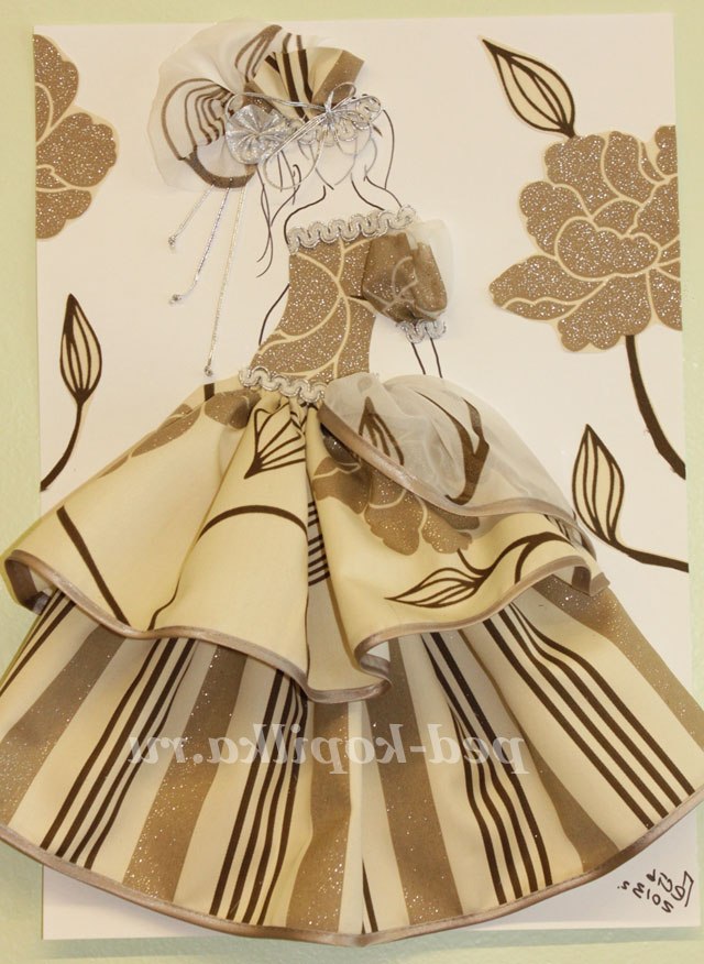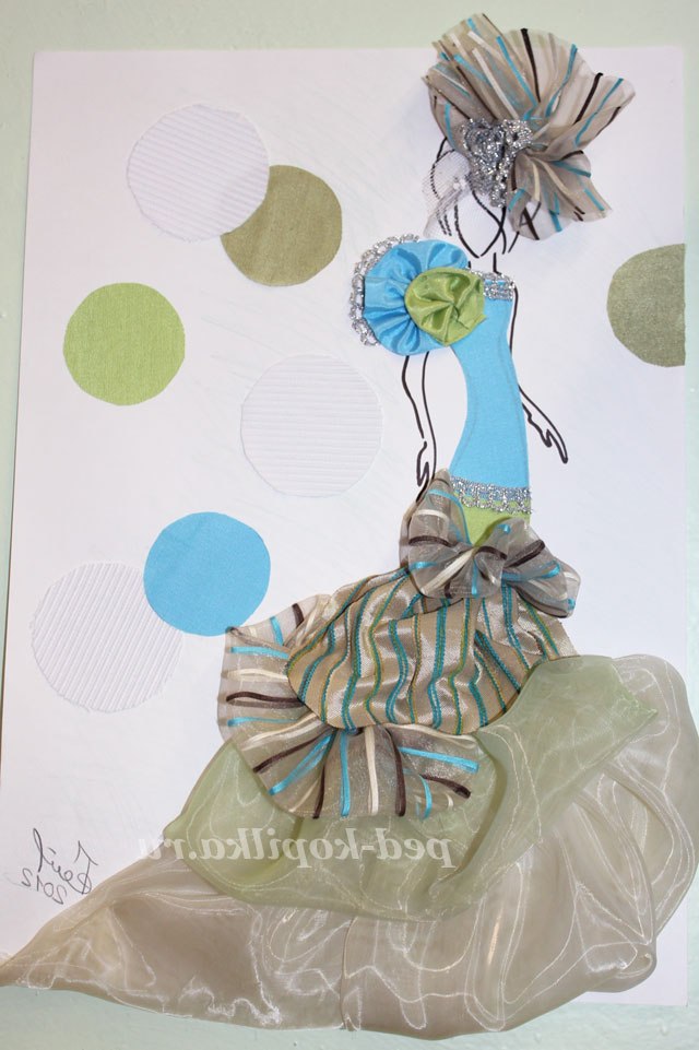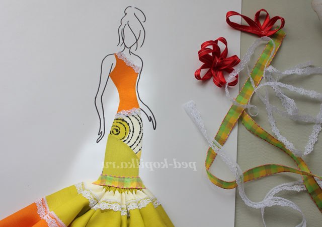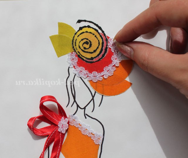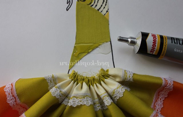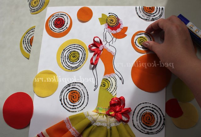 16. Щоб наш наряд гармоніював і виглядав яскраво і зі смаком, необхідно наклеїти клеєм-олівцем заготовлені деталі з тканини на фон. Це можуть бути фігури, вирізані квіти і трави, рельєф, смуги. Головне, щоб фон поєднувався із загальним чином сукні.