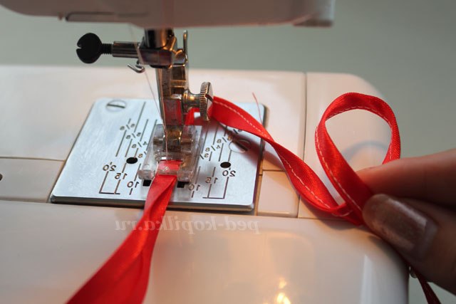 11. Поки проходить попередній процес нам необхідно підготувати деталі для прикраси (скласти, прошити косу бейку по краю).