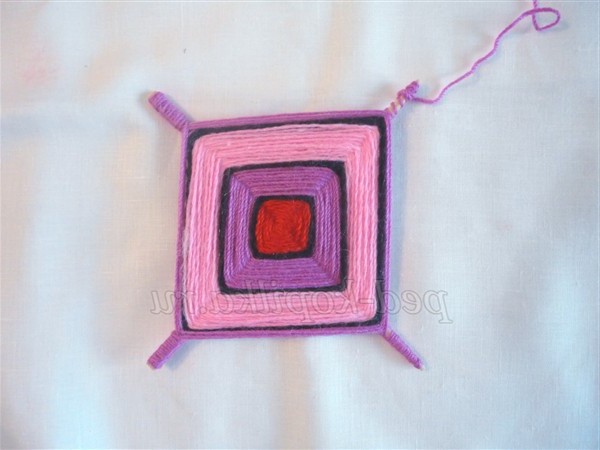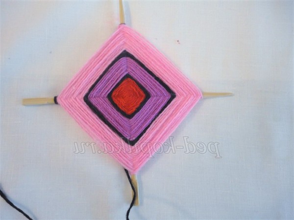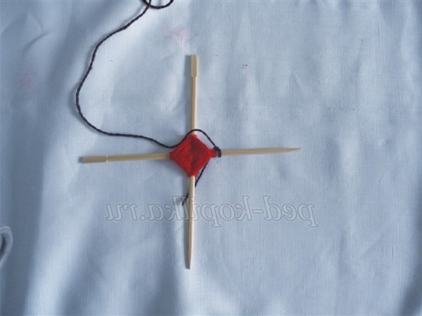 Починаємо плести по колу. Нитка завжди накладається зверху, робимо повний оборот навколо палички. Нитка перекидаємо зверху на наступну паличку. В результаті повинен вийти квадрат. Його розмір залежить від вашого бажання.