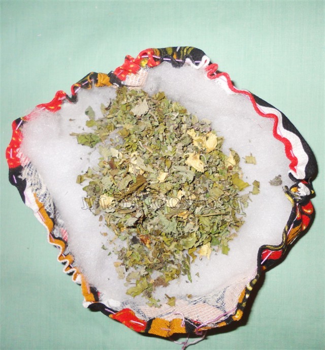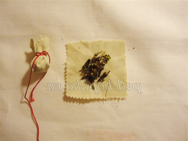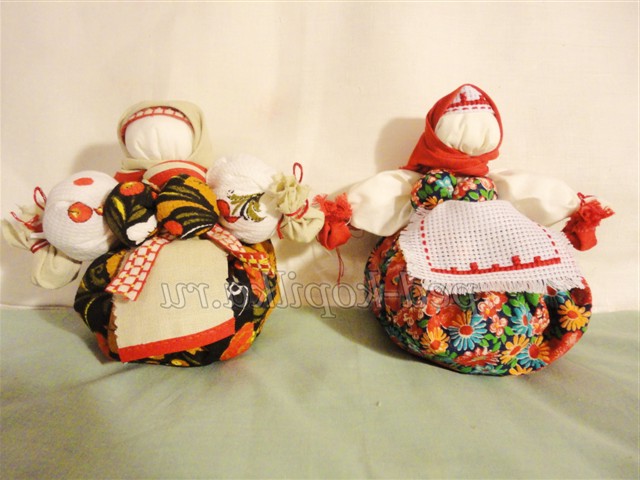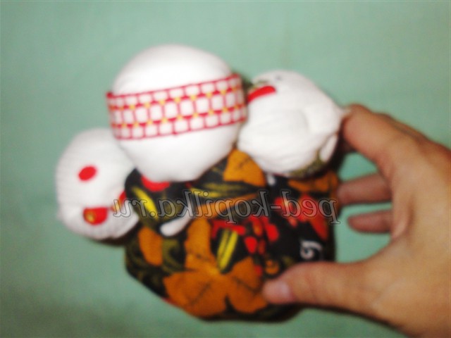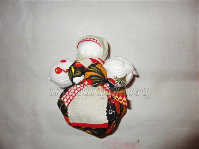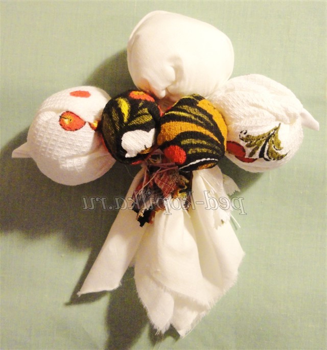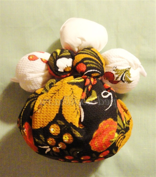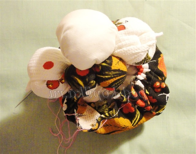 Крок 24. У центр квадрата кладемо подрібнену траву. Зав'язуємо кубушки і кріпимо до рук ляльки.