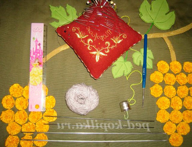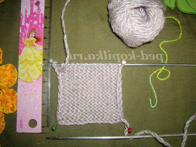 Зв'язати квадрат 6Х6 см з вовни середньої товщини (спиці №3); для цього необхідно набрати на спиці 16 петель і в'язати лицьовій гладдю;