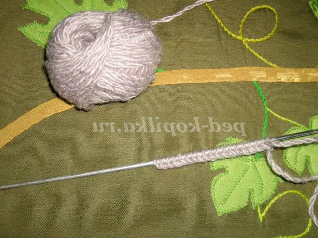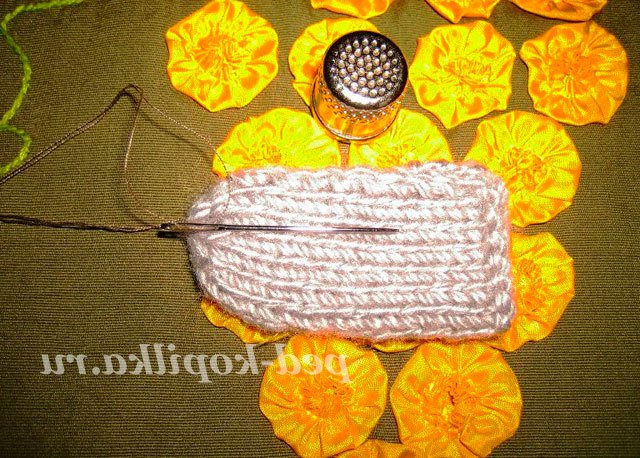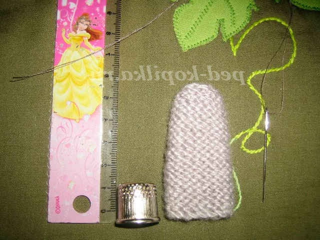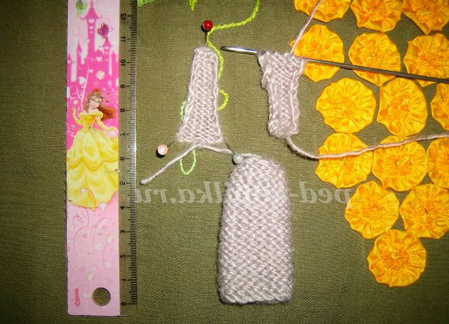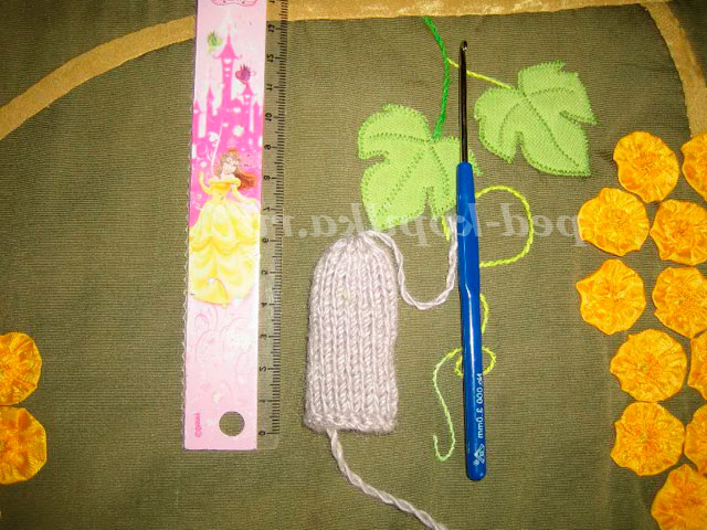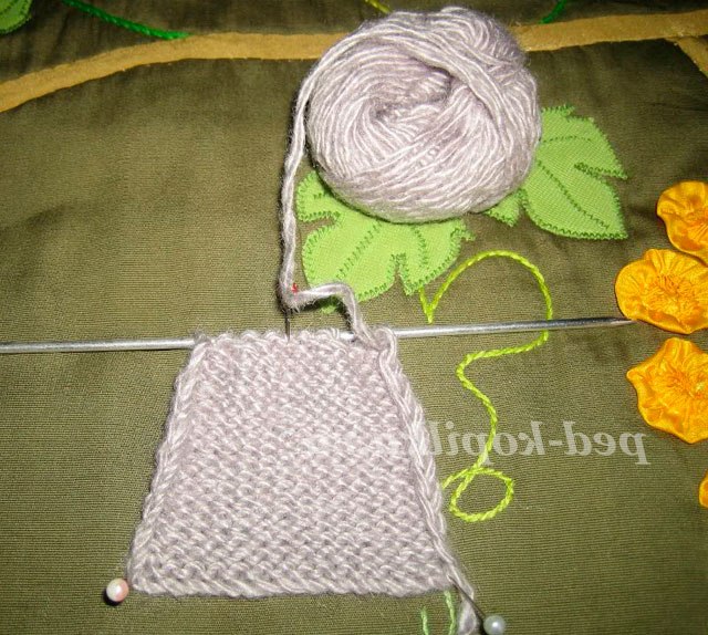 Зв'язати прямокутник 3Х1 см набрати на спиці 6 петель і в'язати 10 рядів «виворітного гладдю» (3 см), скоротити кількість петель на спиці до однієї петлі, закрити ряд