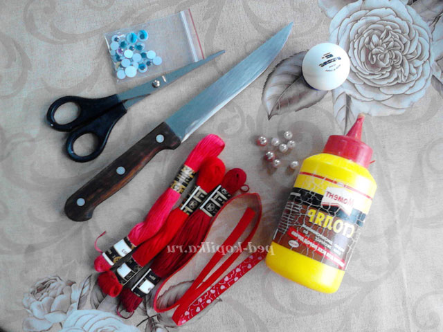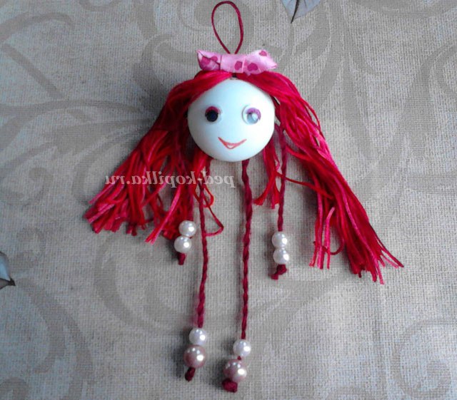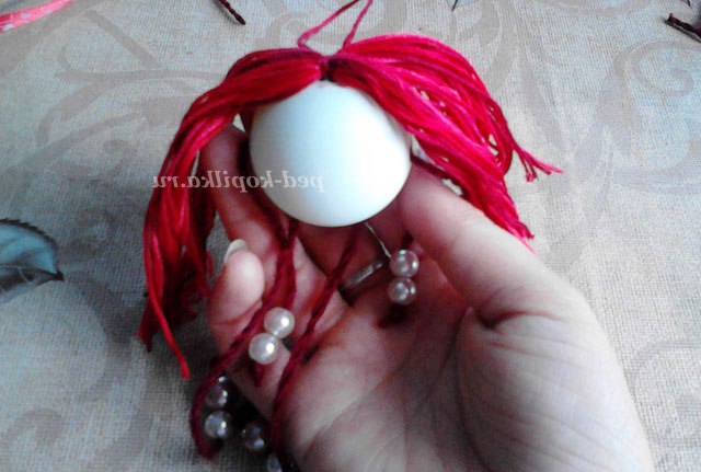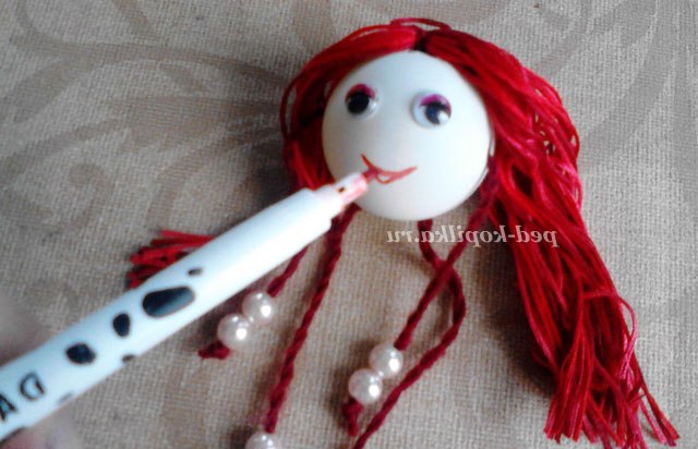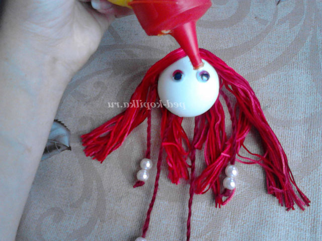 З ниток «Муліне» робимо зачіску для дівчинки. Приклеюємо «волосся» до м'яча на клей «Момент».