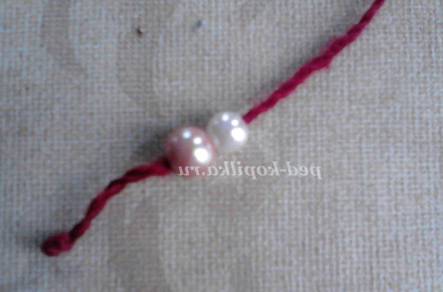 На нитку одягаємо дві намистинки. На кінці робимо вузлик. Це буде ніжка. Довжину робите за бажанням. Потім скибочку і робите вузлик на іншому кінці.