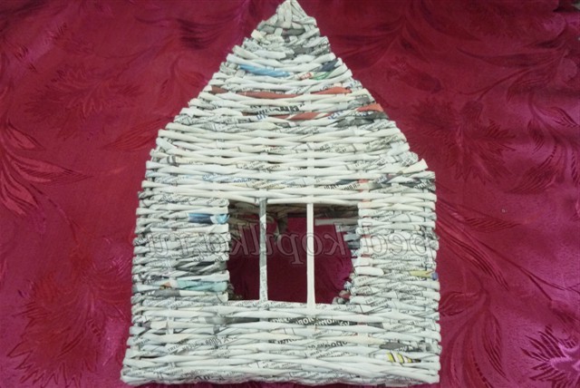 10. Продовжуємо роботу до задуманого розміру нашого будиночка. Прикладаємо трикутник для плетіння фронтонів і плетемо за формою.