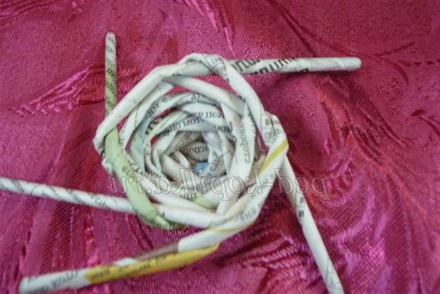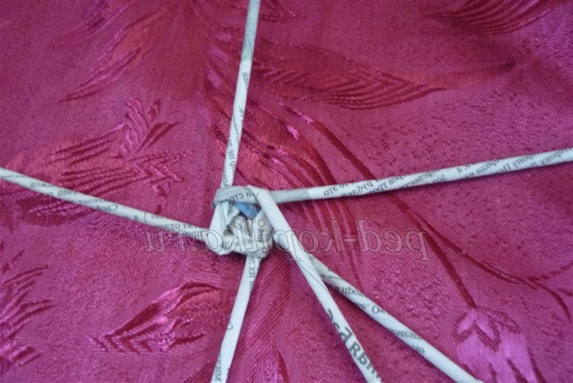 15. Приступаємо до виготовлення маятника годин. Плести його ми будемо косим плетінням. Беремо три трубочки складаємо їх на середині хрестиком..