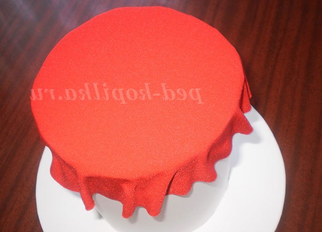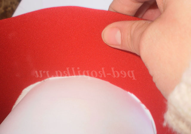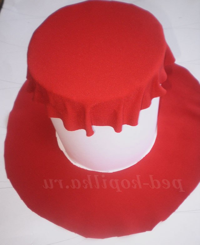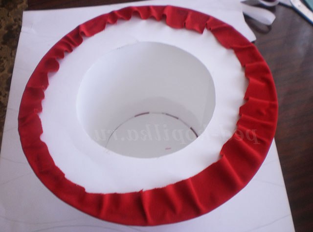 8. Один коло з тканини приклеїмо зверху нашої картонній капелюхи, і залишилися краю прихопимо з нижньої сторони капелюхи.
