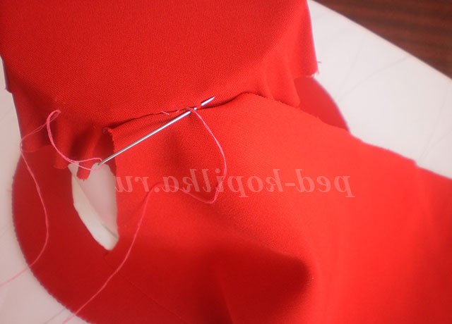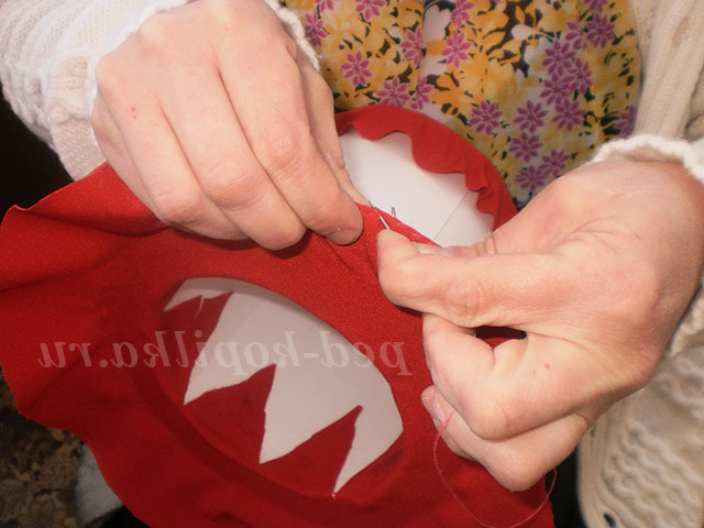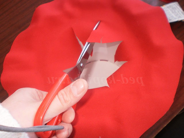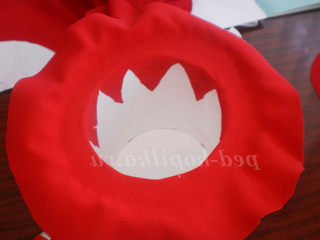 9. Другу викрійку з тканини прихопимо на клей так само до нижньої сторони капелюхи, і приклеїмо нарізані куточки по - всередину капелюшки. Ну, а решту краю пришиваємо з допомогою голки і нитки.