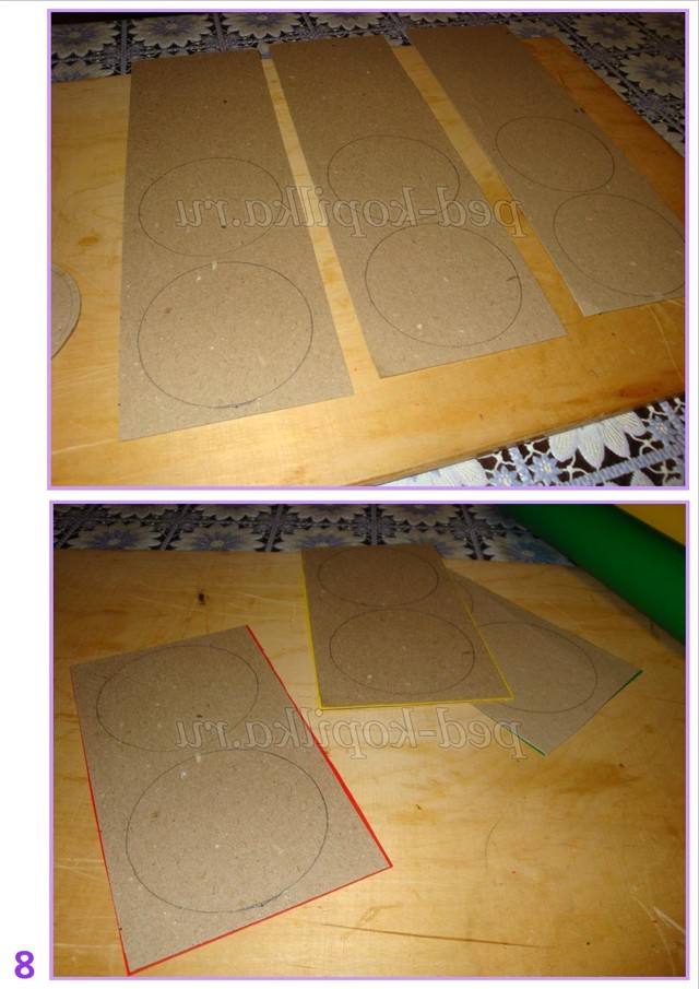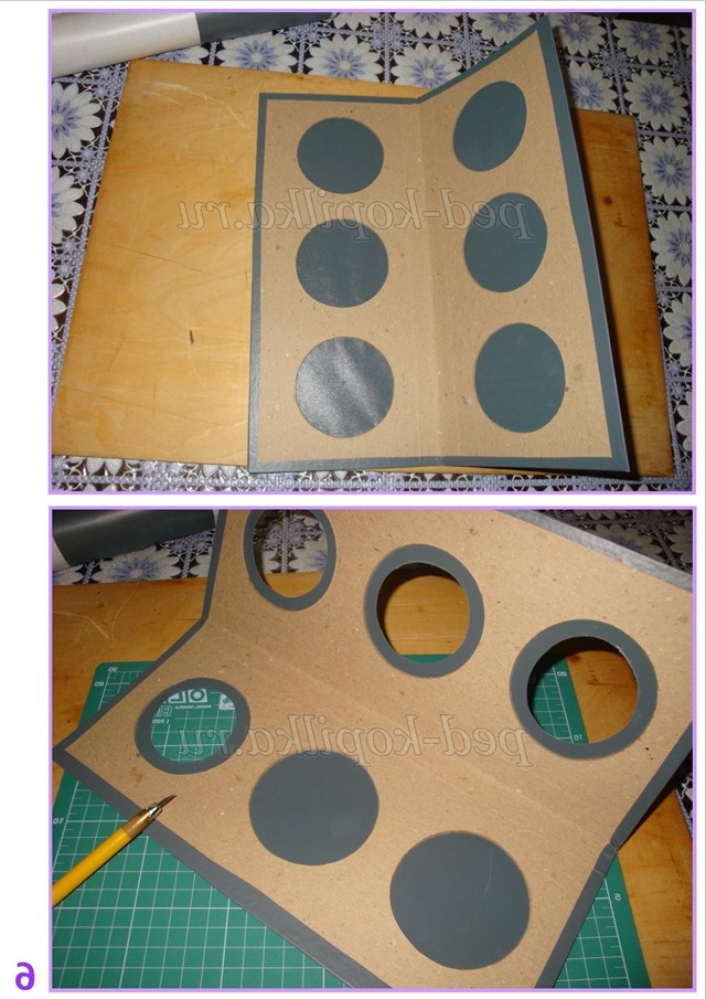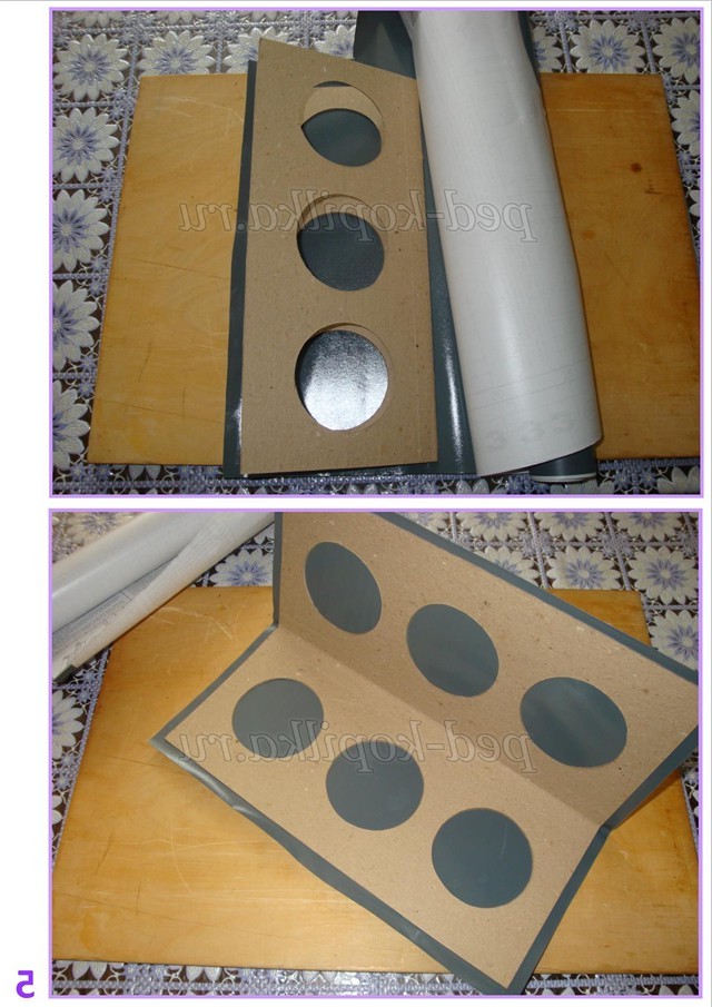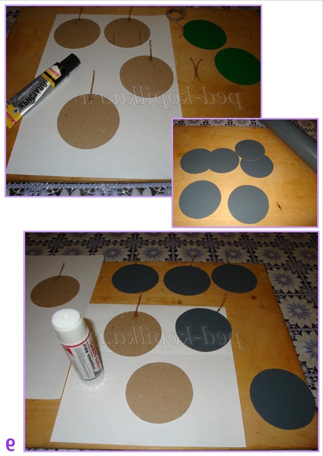 · З решти картону вирізаємо ще шість кіл діаметром 8 см, обклеюємо їх з одного боку сірою плівкою.