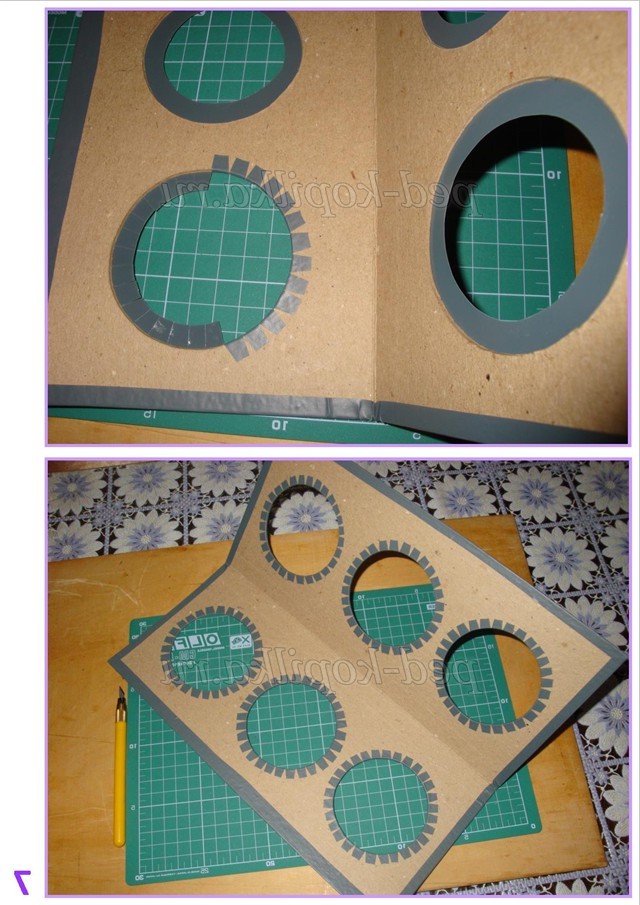 · Макетним ножем вирізаємо всередині наших кіл по плівці «внутрішні» круги, відступивши від краю картону приблизно на 1,2 - 1, 5 див.