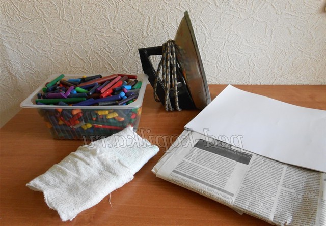 Праска, воскові олівці, глянцевий картон, газети, серветки або дрантя.