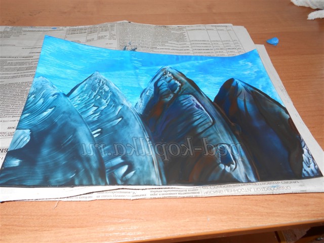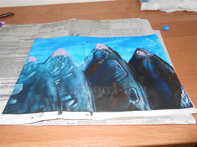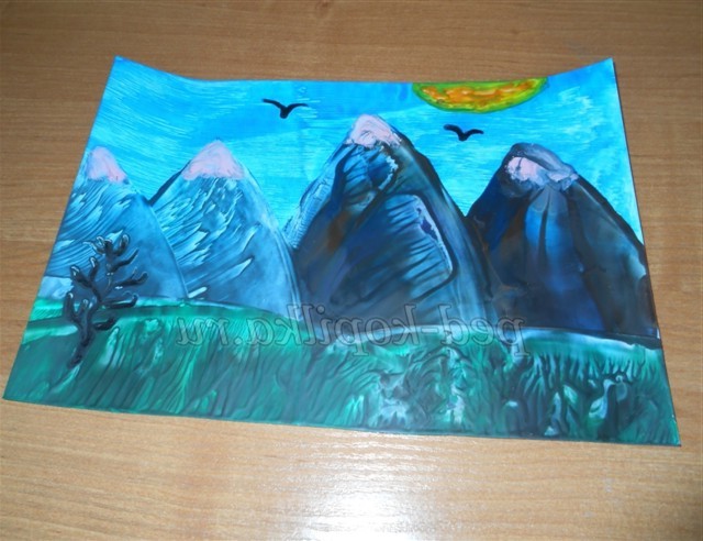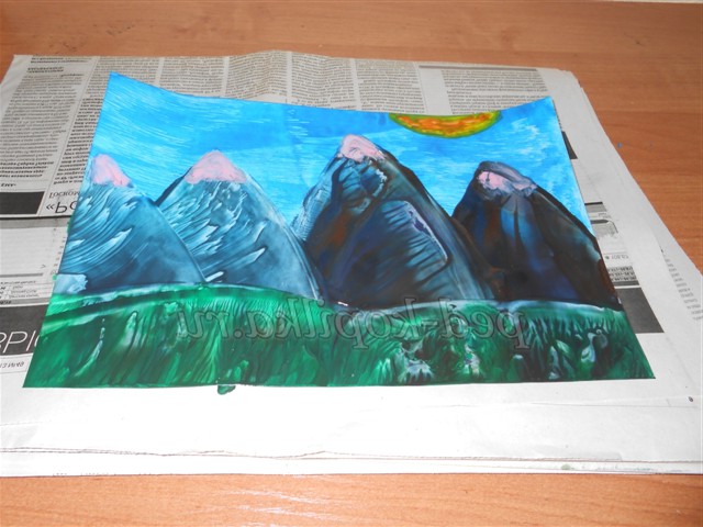 - використовуємо кілька кольорів для гір; гори малюємо способом «притискання» праски до картону: