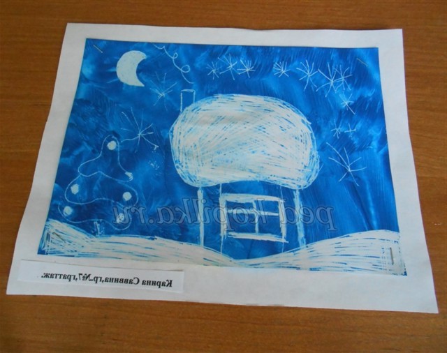 Цю чудову техніку я використовую і в роботі з дітьми старшого дошкільного віку. Готую фон, використовуючи все той же праска і крейда потрібного кольору (праскою орудую сама, діткам ще зарано), а діти процарапивают стеком задуманий малюнок (принцип техніки «граттаж»).