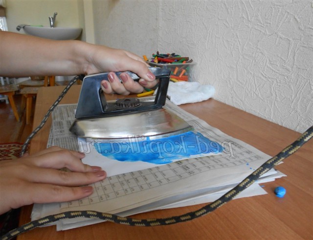 Наплавив потрібну кількість воску, опускаємо праска на картон і плавно проводимо їм по поверхні: