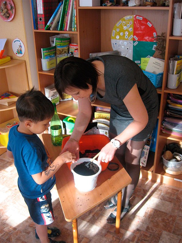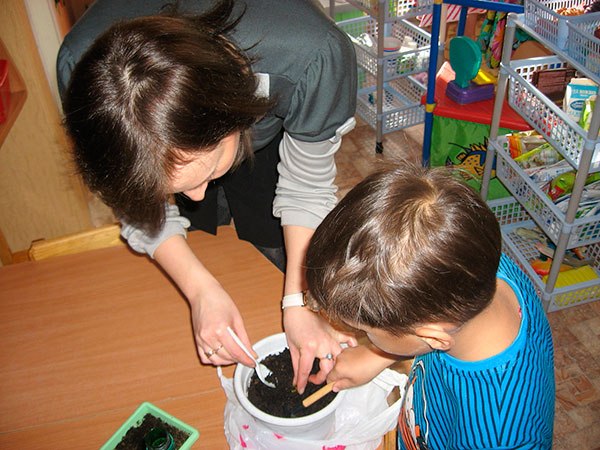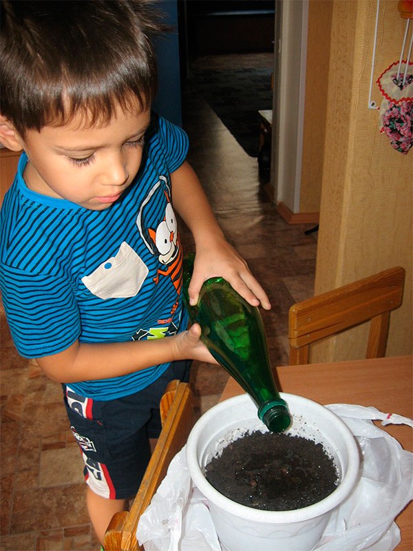 Ми взяли квітковий горщик, насипали в нього перемішану суміш піску і торфу і посадили пророщене насіння, зверху полили водою.